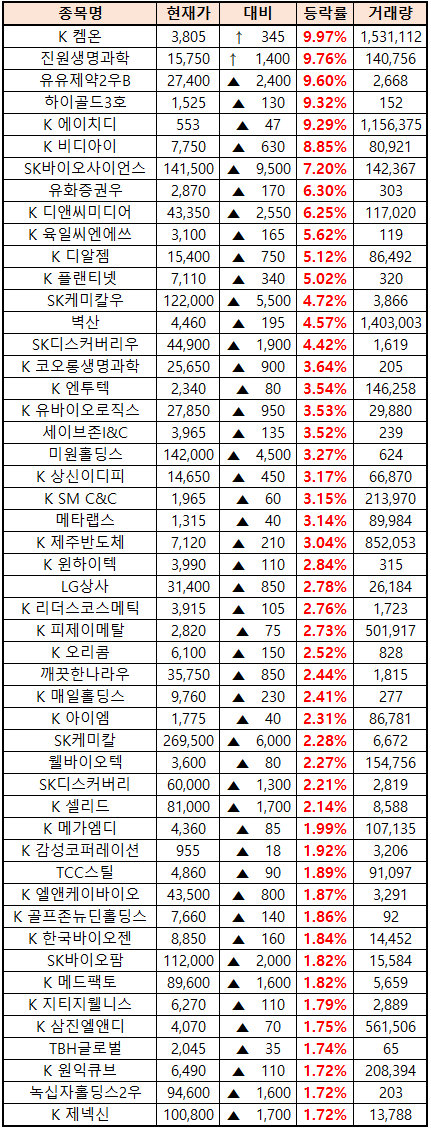시간외 단일가매매 종가 종목 확인시 단순 급등주 등락률만 볼 것이 아니라, '거래량'에 따르는 거래대금도 판단하면서 보는 것이 중요합니다.