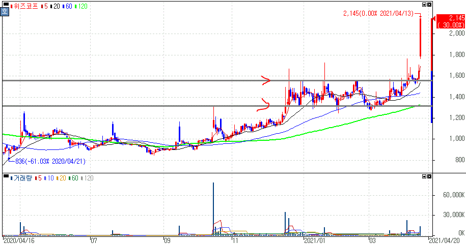 주유소 휘발유 가격 상승으로 수익개선 및 윤석열 테마주 부각으로 상한가를 기록한 위즈코프 주가 입니다.