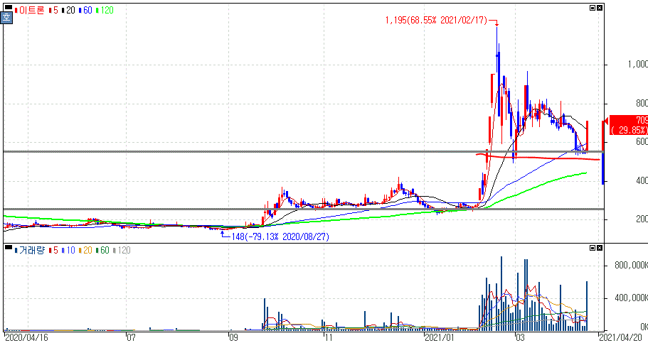 인도에서 스푸트니크V 긴급사용승인 소식이 나오면서 상한가를 기록한 이트론인데 당시 부각을 받았던 스푸트니크V 관련주 종목을 본다면 이아이디 +24.84%, 이화전기 +17.70%, 이수앱지스 10.92%, 바이넥스 +14.14%, 이디티 -2.44% 흐름을 보였습니다.