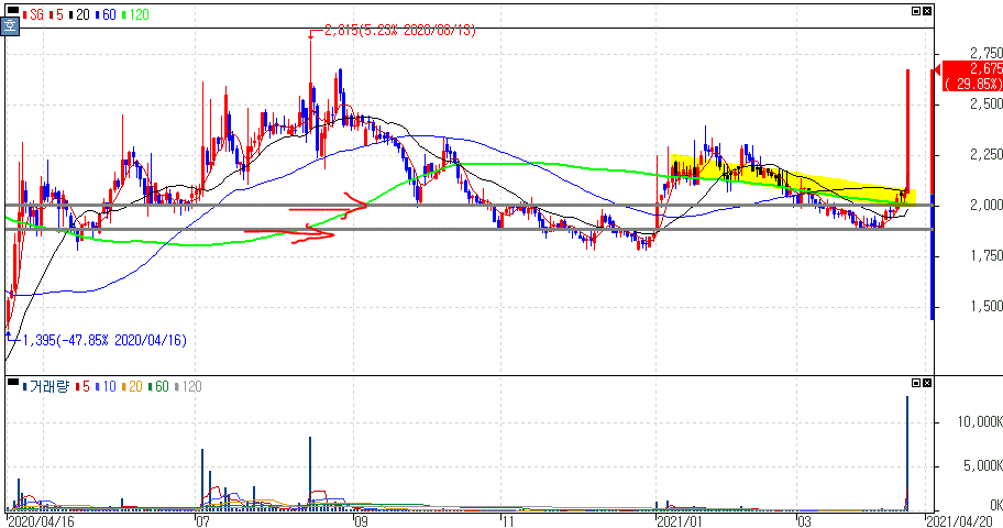 재료미노출(수급대란, 윤석열, 방사능, 건설경기) 상한가를 기록한 SG 주가 입니다.