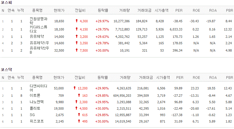 코스피에서는 진원생명과학, 키다리스튜디오, 유유제약, 유유제약1우, 유유제약2우B가 상한가를 기록하고, 코스닥에서는 디앤씨미디어, 이트론, 나노엔텍, 플리토, SG, 위즈코프가 상한가를 기록했습니다.