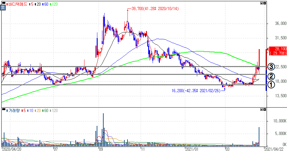 타액 이용 코로나19 감염여부 판별 진단키트 개발 소식에 상한가를 기록한 바디텍메드 주가 입니다.