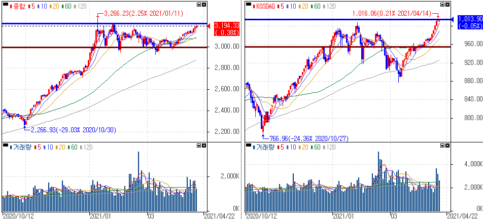 경기 회복과 기업 실적 개선 기대감과 동시에 코로나19 재확산 우려 지속에 혼조세를 보이는 모습이였습니다.