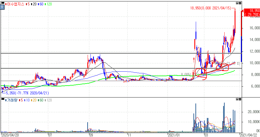 러시아 '스푸트니크V' 백신 기술이전 국내 1호 계약 완료 소식에 상한가를 기록한 이수앱지스 주가 입니다.