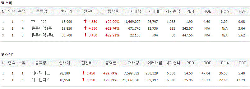 코스피에서는 한국석유, 유유제약1우, 유유제약2우B가 상한가를 기록했고, 코스닥에서는 바디텍메드, 이수앱지스가 상한가를 기록했습니다.