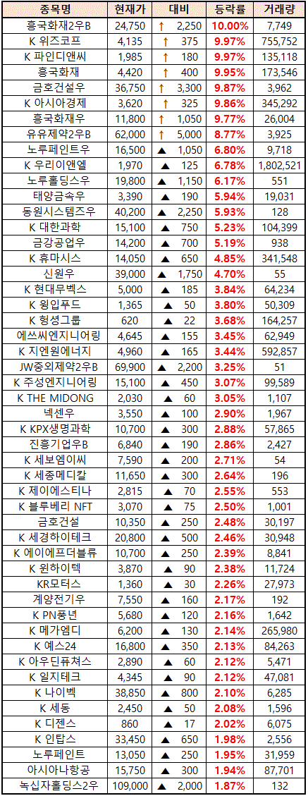 시간외 단일가매매 종가 종목 확인시 단순 급등주 등락률만 볼 것이 아니라, '거래량'에 따르는 거래대금도 판단하면서 보는 것이 중요합니다.