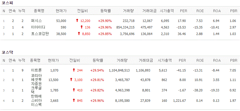 코스피에서는 퍼시스, 이아이디, 포스코강판이 상한가를 기록했고, 코스닥에서는 코리아에셋투자증권, 크루셜텍, 한화에스비아이스팩이 상한가를 기록했습니다.