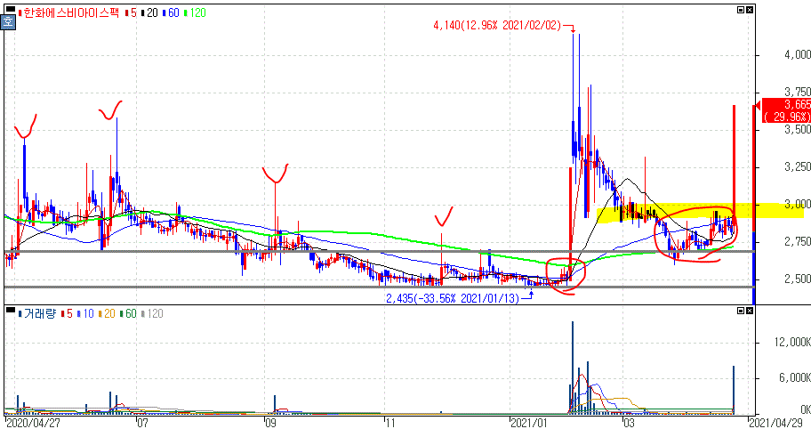 일반적인 기업인수목적회사인 스팩과는 다르게 한화에스비아이스팩은 정치테마주로 편입이되면서 다른 흐름을 보여주기도 하죠.