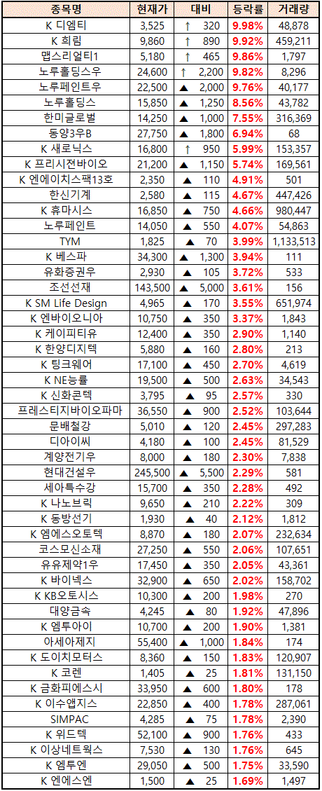 시간외 단일가매매 종가 종목 확인시 단순 급등주 등락률만 볼 것이 아니라, '거래량'에 따르는 거래대금도 판단하면서 보는 것이 중요합니다.