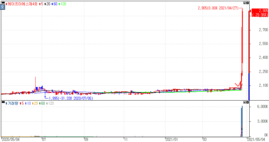 윤석열 테마주로 새로 편입되면서 상한가를 기록한 케이프이에스제4호 주가 입니다.