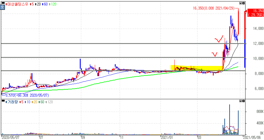 자주 상한가를 기록하고 있는 노루홀딩스우와 재부각을 보인 대상홀딩스우 입니다. 정체테마주 특성만 아니라, 단기적으로 가파른 흐름들에 유의하시길 바랍니다.