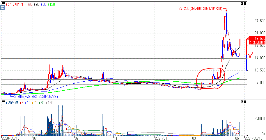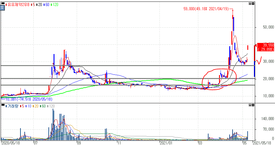 에스디바이오센서 IPO 기대감에 상한가를 기록한 유유제약1우, 유유제약2우B 주가 입니다.