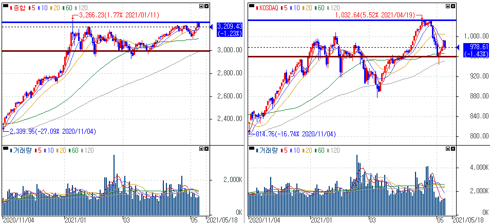 금일 코스피 지수는 -1.23% 하락한 3,209.43에 마감하였고, 코스닥 지수는 -1.43% 하락한 978.61에 마감하였습니다. 하루만에 인플레이션 우려가 다시 나오면서 어제 지수 상승폭을 다시 반납하는 상황이 연출되었습니다.