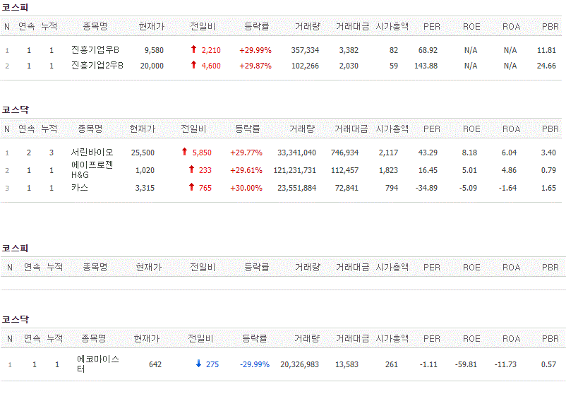 코스피에서는 진흥기업우B, 진흥기업2우B가 상한가를 기록했고, 코스닥에서는 서린바이오, 에이프로젠H&G, 카스가 상한가를 기록했습니다. 반면 에코마이스터가 하한가를 기록했습니다.