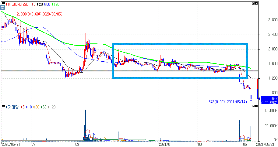 에코마이스터 주가 :: 2021년 05월 14일 하한가 종목