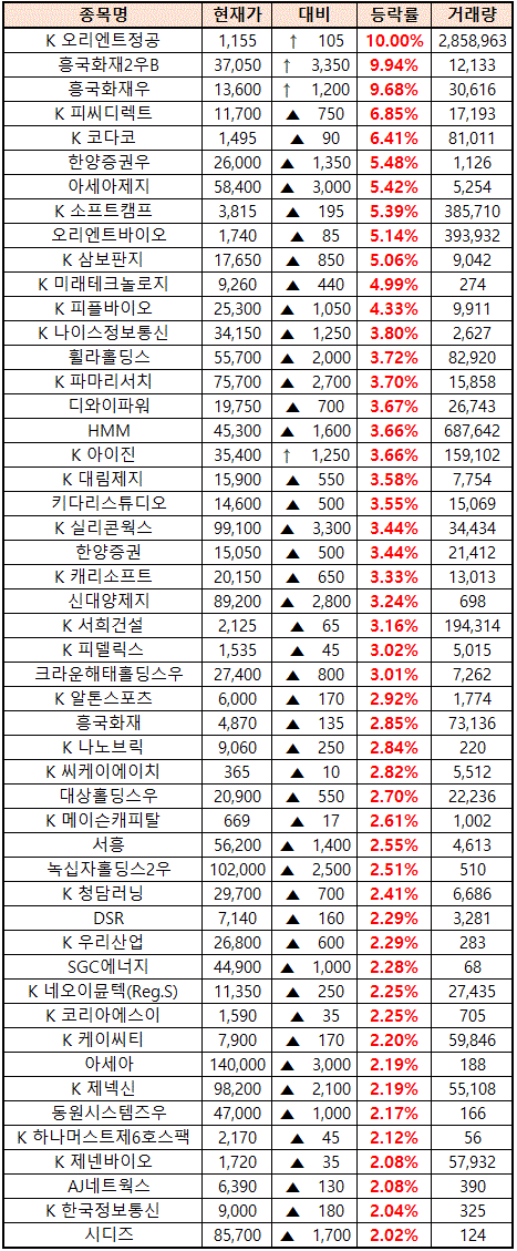 시간외 단일가매매 종가 종목 확인시 단순 급등주 등락률만 볼 것이 아니라, '거래량'에 따르는 거래대금도 판단하면서 보는 것이 중요합니다.