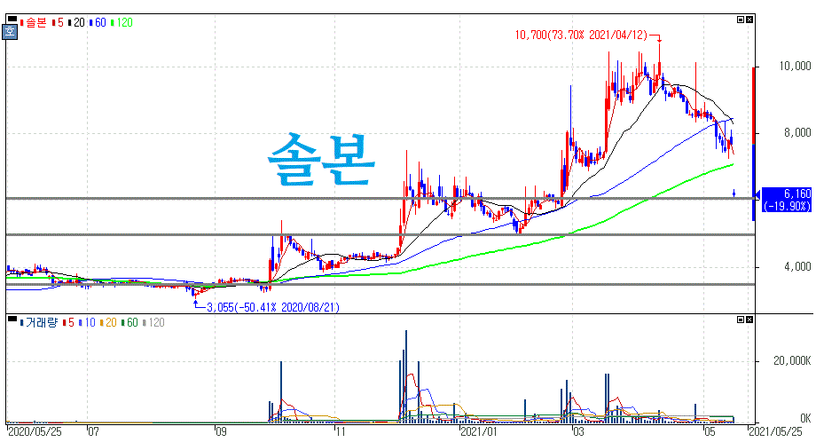 또한 키네마스터 인수전 흥행으로 지분 매각 가치에 대해서 높게 받아 수혜를 받을 최대주주 솔본의 주가 또한 장중 급락을 보여주고 있죠.