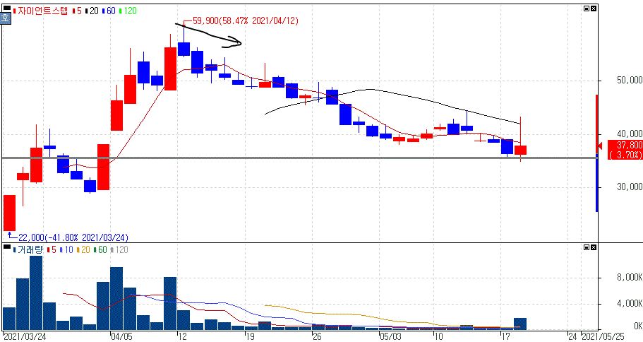 자이언트스텝은 AI 기반의 리얼타임 콘텐츠 솔루션 전문업체로 VFX 기술을 기반으로한 메타버스 콘텐츠 기술 역량을 가지고 있는 업체 입니다. 지난 3월 메타버스 관련주 흥행과 함께 신규상장으로 높은 상승을 보였던 종목입니다. 지난 고점으로부터 약세 흐름은 이어지는 상황입니다.