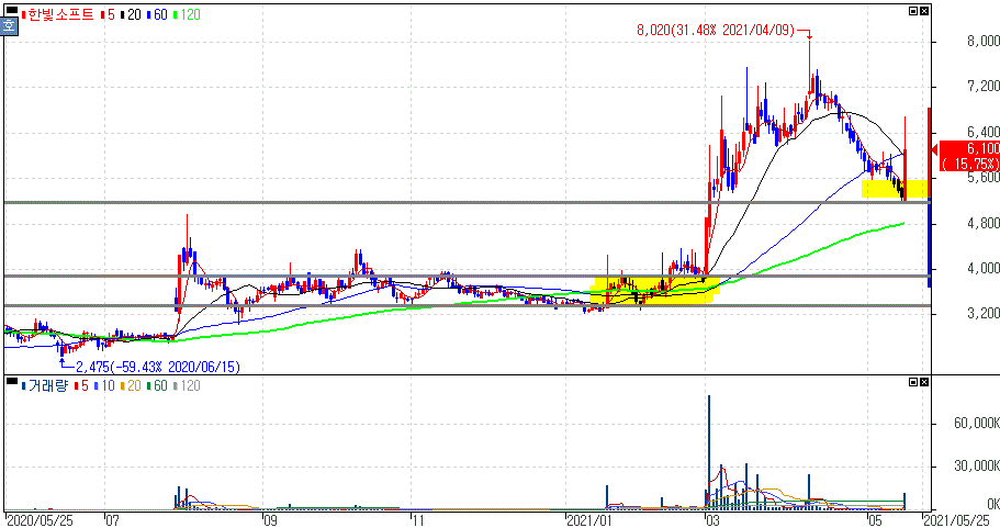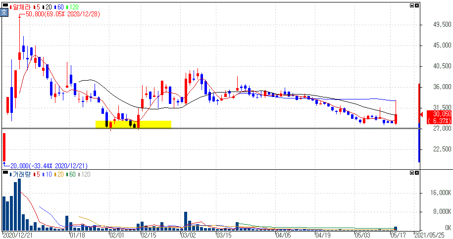 알체라는 최대주주 스노우가 메타버스 플랫폼 제페토를 서비스하는 네이버제트의 모회사 입니다. 지난 연말에 신규상장했던 종목으로 여전히 공모가 상회를 유지하면서 지난 지지구간에서 시세를 보여주는 모습입니다.
