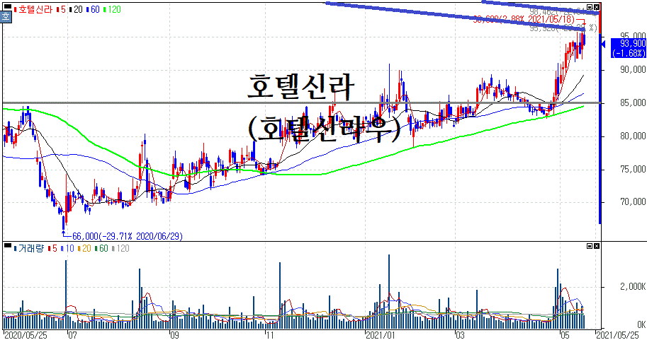 호텔업에 대한 시각이 국내 여행지 관광객 급증으로 인한 수요가 매출로 이어질 수 있다는 기대감이 있기 때문에 전체적인 주가 흐름들은 상승을 보여왔다는 것을 알 수 있습니다.