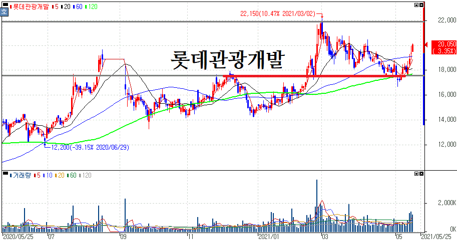 롯데관광개발의 주가 흐름은 이미 펜더믹으로 인한 급락 저점 이후 줄곧 상승 흐름을 유지해왔다는 것을 알 수 있는데요. 보통의 시각으로 펜더믹은 종식될 것이고, 안정적으로 돌아오는 것은 시기적인 차이가 있을 뿐이지 복구는 될 것이라는 것이죠.