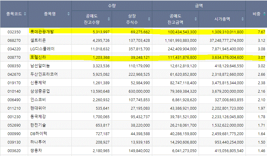 국내 주식시장에서 롯데관광개발은 공매도잔고금액 비중 7% 이상을 차지하면서 공매도의 주 타겟 셀트리온보다도 높은 공매도 잔고비율을 가지고 있습니다.