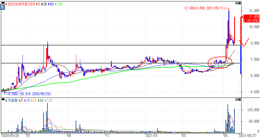 재료 미노출 상한가를 기록한 코리아써키트2우B 주가 입니다.
