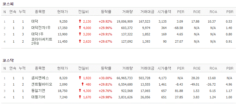 코스피에서는 대덕, 대덕전자1우, 대덕1우, 코리아써키트2우B가 상한가를 기록했고, 코스닥에서는 센트럴바이오, 동일기연, 대동기어가 상한가를 기록했습니다.
