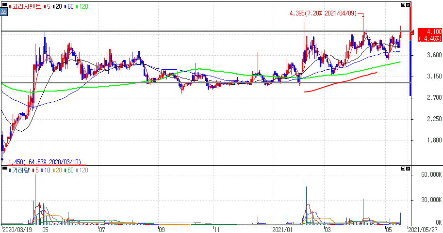 고려시멘트는 시멘트 생산, 판매하는 업체로 소폭 상승을 보여준 모습의 고려시멘트 주가 차트 입니다. 펜더믹 이후 다른 산업들에 비해 비교적 상승폭 차이를 파악해 보실 수 있습니다.