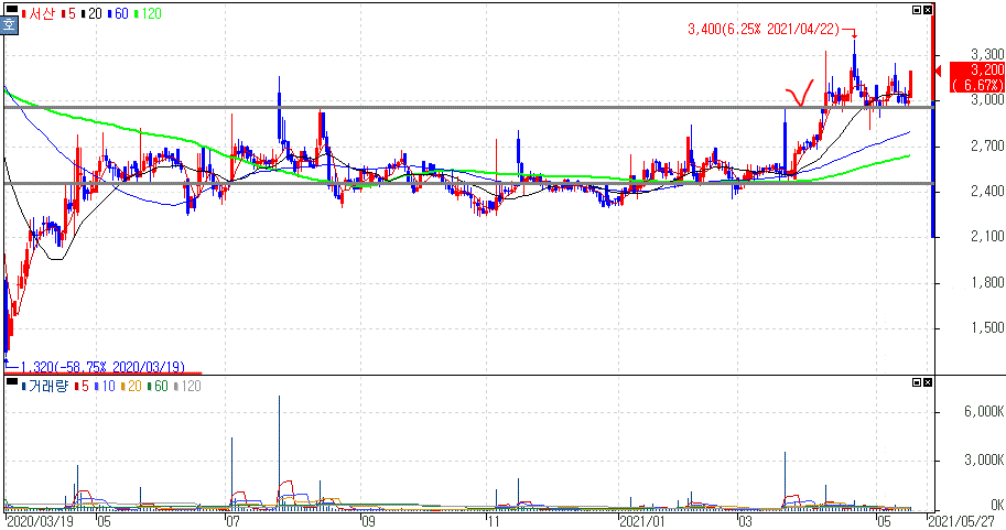 서산에서는 시멘트 원재료 하는 제품을 생산하는 업체인데 금일 소폭 상승세를 보여준 모습입니다. 거래량은 크게 보여주지 않았다는 것을 확인할 수 있습니다.