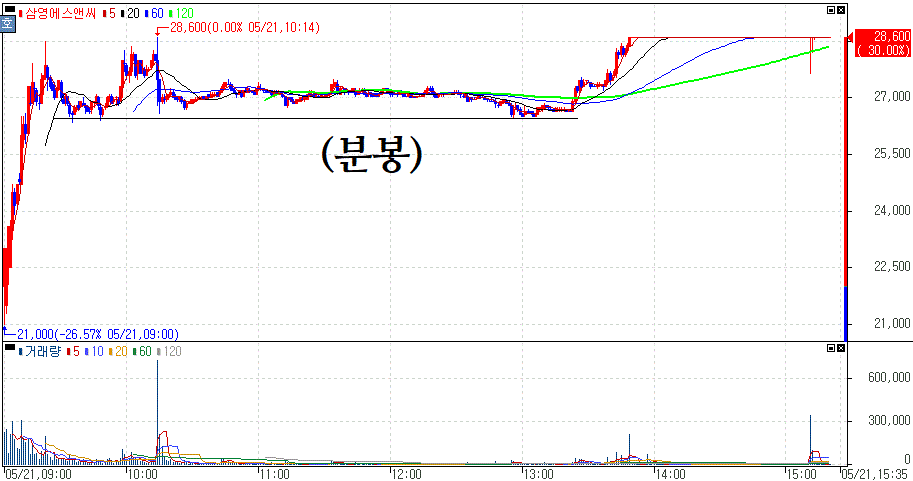 확정공모가 11,000원이였던 삼영에스앤씨는 공모가 2배인 22,000원에 시초가를 형성해 30% 상한가까지 이어갔습니다. 지난해 매출액 136억원으로 영업이익 1억 9,000만원인 삼영에스앤씨는 성장성특례 종목을 통해서 코스닥시장에 입성하게 된 종목입니다.