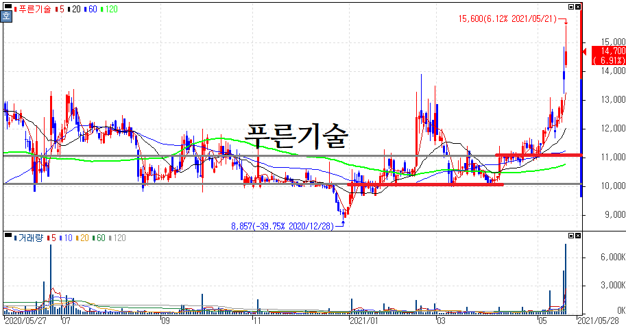 이번 주중에 시간외 종목에서도 눈에 띄던 푸른기술입니다. 지난주 워낙 다른 디지털화폐 관련주 종목 부각 당시 거래량도 잠잠하게 있던 종목이였는데 만만치 않은 상승을 보여줬었습니다.