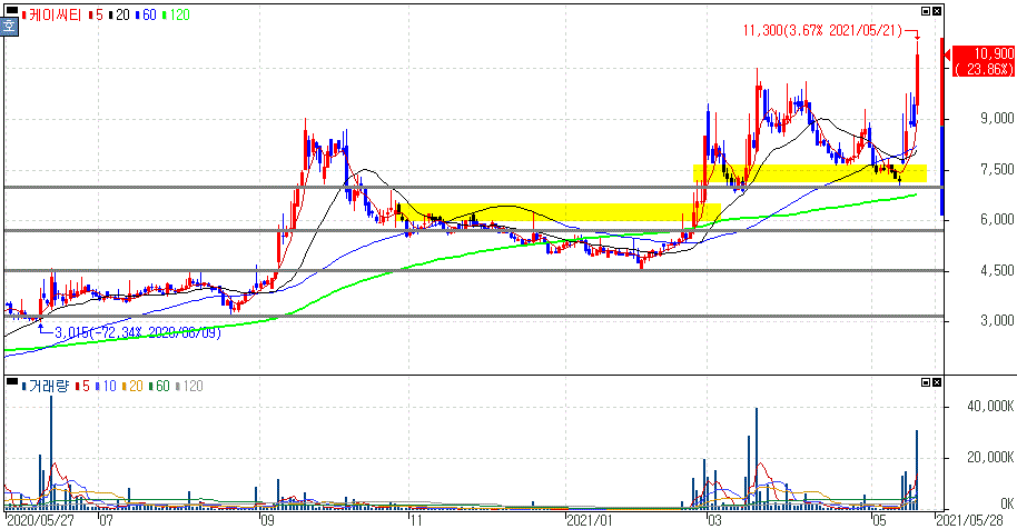 지난주 상한가 근접해 갔지만 +7%대 마감을 보였던 케이씨티는 오늘도 상한가 인접한 상승을 보였으나 상한가를 가기에는 역부족이였던 모습을 보였습니다.