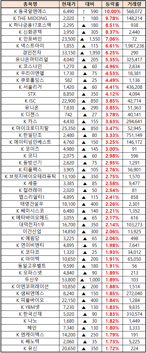 시간외 단일가매매 종가 종목 확인시 단순 급등주 등락률만 볼 것이 아니라, '거래량'에 따르는 거래대금도 판단하면서 보는 것이 중요합니다.