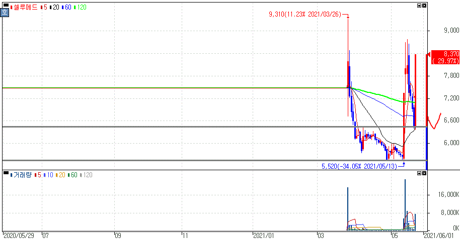 정부, mRNA 백신 컨소시엄 구축 및 아이진과 코로나19 mRNA 백신 연구개발 및 사업화 공동 협력을 위한 양해각서(MOU) 체결 소식에 상한가를 기록한 셀루메드 주가 입니다.