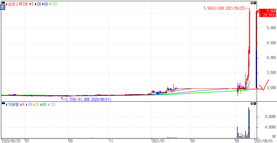 어제도 말씀드렸지만 '엔피'라는 메타버스 사업 추진중인 업체와 스팩상장이 예정되어 있기 때문에 어제 메타버스 관련주 종목들이 부각을 보이면서 동반 상승을 보였던 삼성스팩2호 입니다. (어제 +25.33% 상승마감)