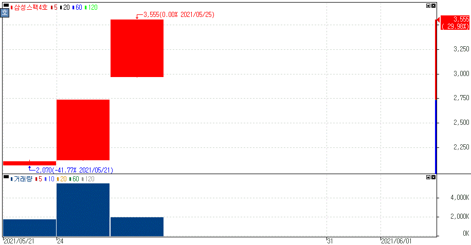 재료 미노출 및 삼성스팩2호 동반상승으로 연속 상한가를 기록한 삼성스팩4호 주가 입니다.