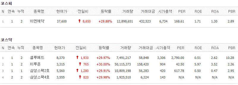 코스피에서는 이연제약이 상한가를 기록했고, 코스닥에서는 셀루메드, 삼성스팩2호, 삼성스팩4호가 상한가를 기록했습니다.