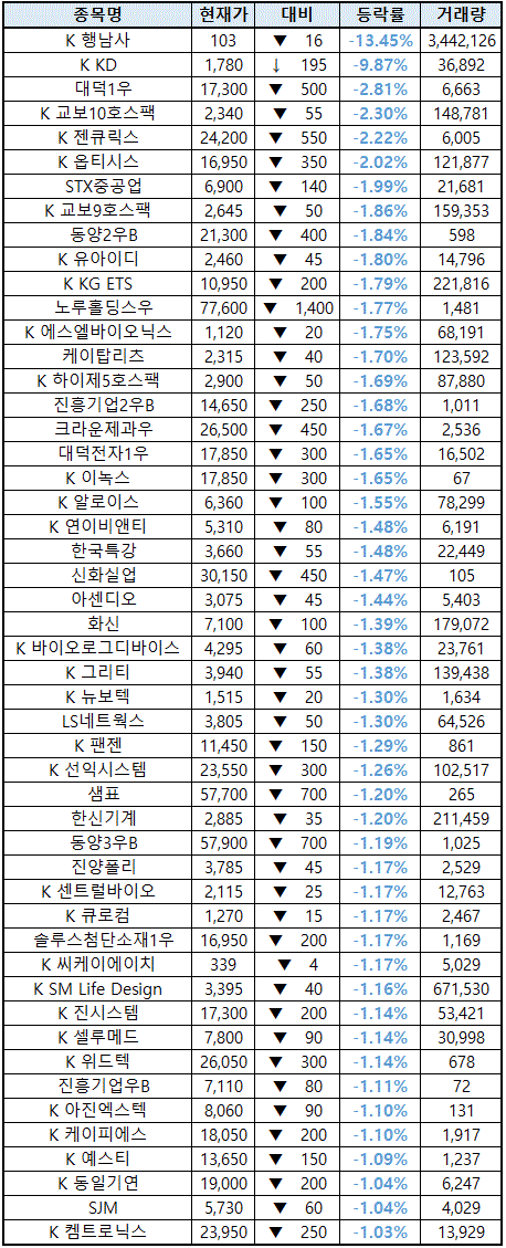 (종목명 앞에 'K'는 코스닥 종목을 의미합니다.)