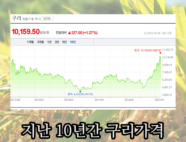 구리의 이 가격은 2011년 2월 이후 없었던 가격이다보니 10년여만에 1만달러를 돌파한 것이죠. 이 같은 구리가격이 상승을 보이면서 구리 관련 제조사나 유통사 그리고 시공업체들까지도 영향을 받게 되는데요.