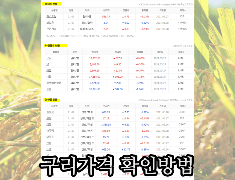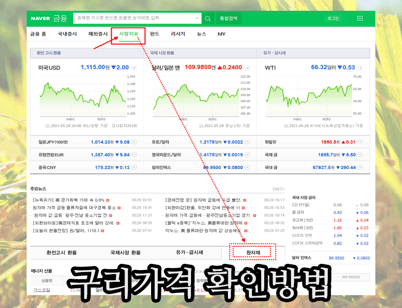 국제 구리시세를 확인하는 방법에 대해서는 '구리'를 검색해도 되지만 우리는 투자자니 전반적인 시장지표를 확인해야죠. 앞서 국제곡물가격 확인하는 방법과 동일하니 쉽게 따라하실 수 있을겁니다.
