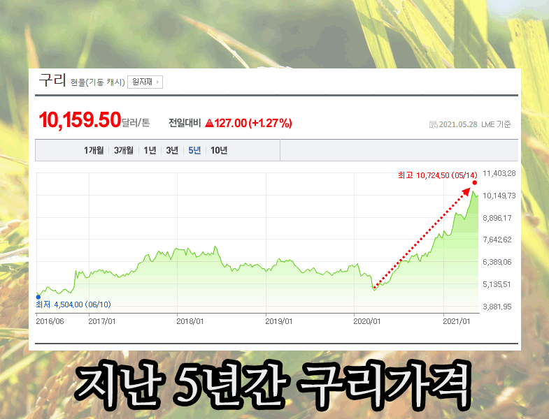 국제구리가격 상승으로 주식시장에서의 구리관련주가 무조건 상승을 보여줬던 것은 아닙니다. 그동안 시장 전반적으로 영향을 끼칠 수 있는 가격 변동성이 아니였기 때문이라고 볼 수 있는데 지난 5년간 구리가격에서 코로나19 펜더믹부터 가격을 본다면 충분히 납득이 될 수 있는 가격폭이죠.