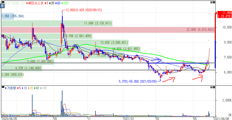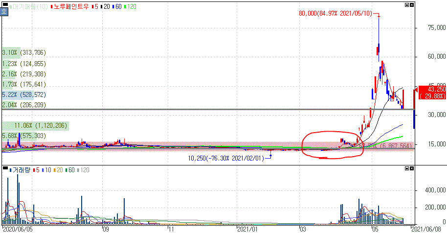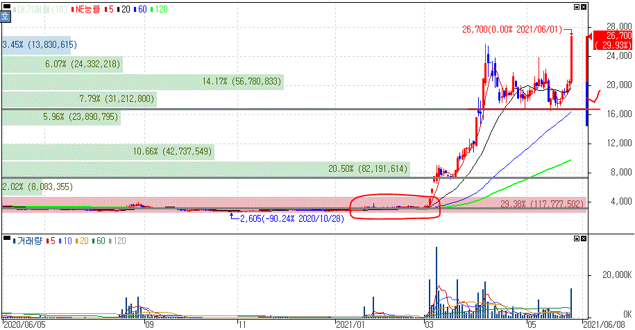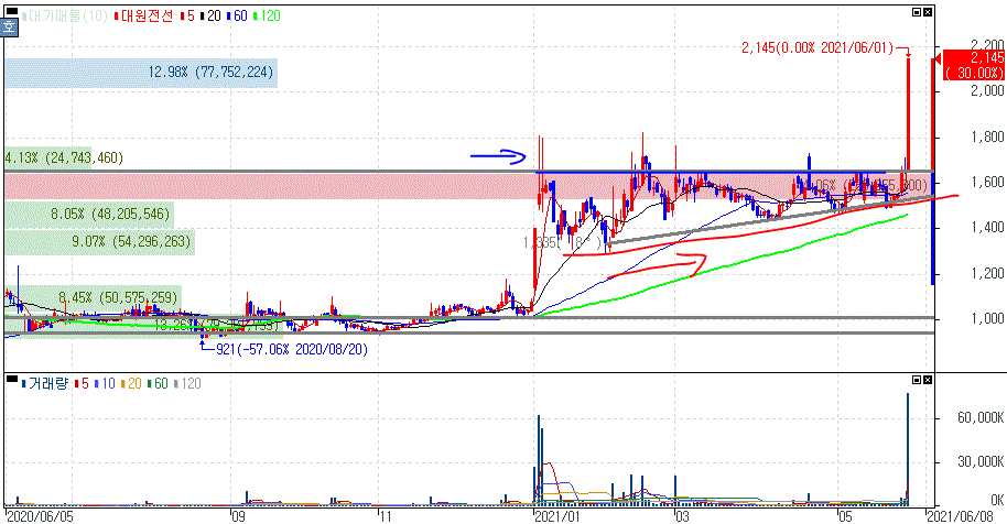 일단 대원전선은 올해 초 급등을 보여준 이후 중요한 흐름을 보였다는 것을 알 수 있을겁니다. 당시 대원전선은 현대차의 아이오닉5 공개 예정에 기대감과 철도사업에 70조원 투자 소식과 겹치면서 상한가를 기록했죠.