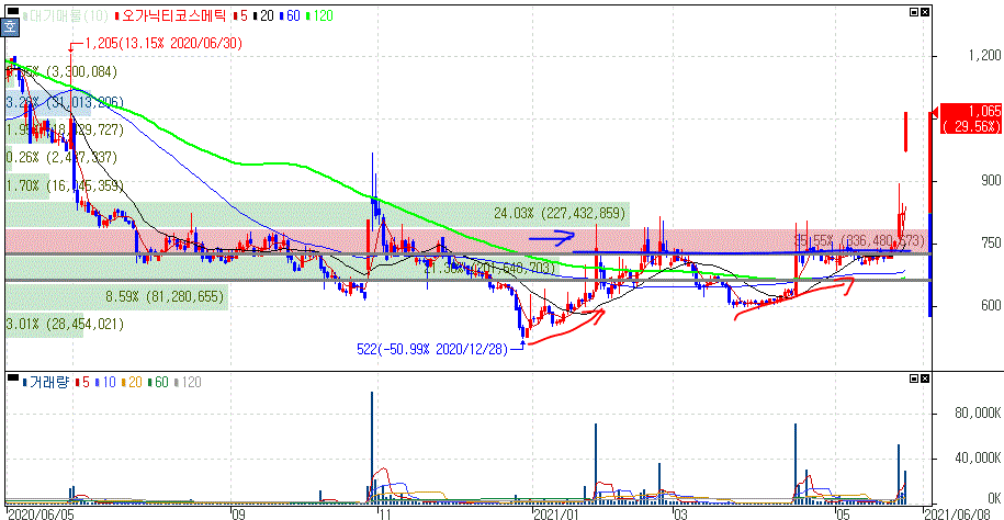 오가닉티코스메틱 경우 추세 전환 분위기 속에서 구간을 형성하면서 일정기간 전환의 기회를 보여주고 있습니다.
