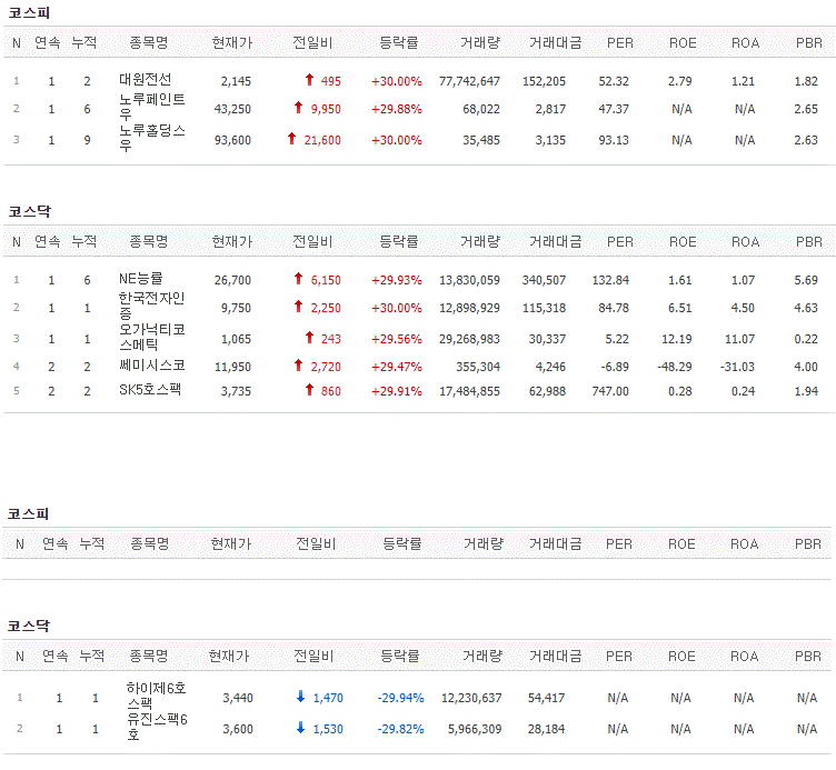 코스피에서는 대원전선, 노루페인트우, 노루홀딩스우가 상한가를 기록했고, 코스닥에서는 NE능률, 한국전자인증, 오가닉티코스메틱, 쎄미시스코, SK5호스팩이 상한가를 기록했습니다. 반면 하이제6호스팩과 유진스팩6호가 하한가를 기록했습니다.
