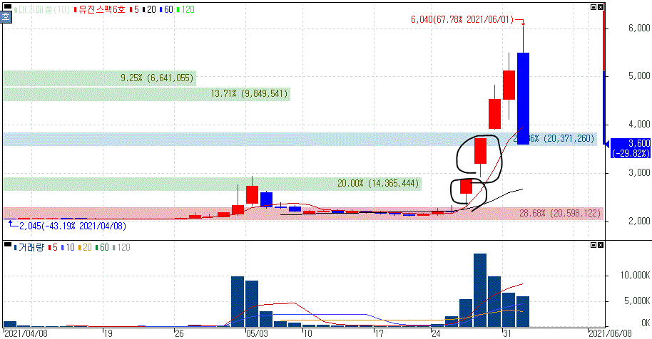 최근 기업인수목적회사(SPAC) 테마 이상 급등세 속 급락으로 하한가를 기록한 하이제6호스팩, 유진스팩6호 주가 입니다.