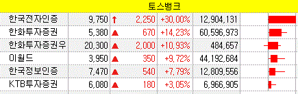토스가 나스닥 상장한다는 기대감으로 지분가치가 부각 됐습니다. 상한가를 기록한 한국전자인증, 한화투자증권, 이월드 주가 등의 종목이 부각을 보였으며, 핀테크 및 인터넷은행 관련주 종목들이 간접적으로 상승을 보였습니다.