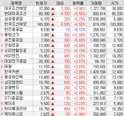 대우조선해양, 현대미포조선, 삼성중공업, 한국조선해양 주가 등의 조선주를 중심으로 한 상승과 함께 조선기자재 종목들이 조선업 슈퍼사이클에 따른 국내 조선3사 실적 개선 기대감으로 부각을 보였습니다.