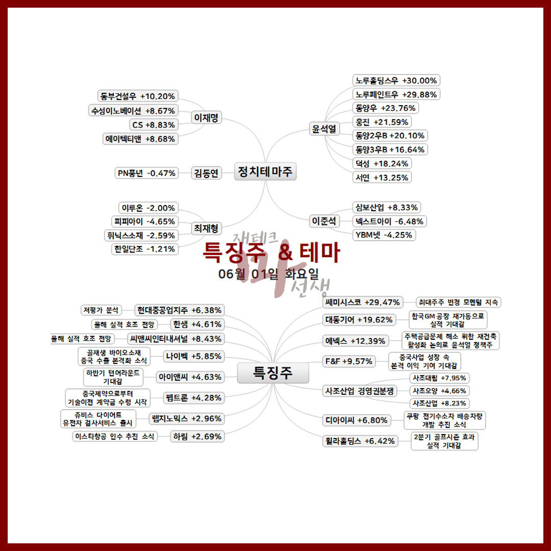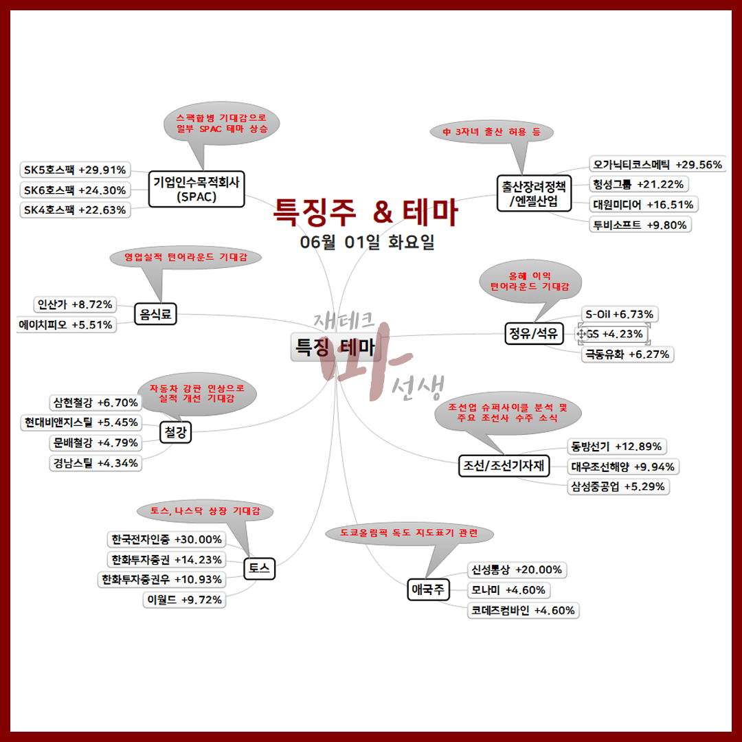 6/1 특징주 테마주 산아제한완화,토스,조선기자재,애국주,윤석열관련주