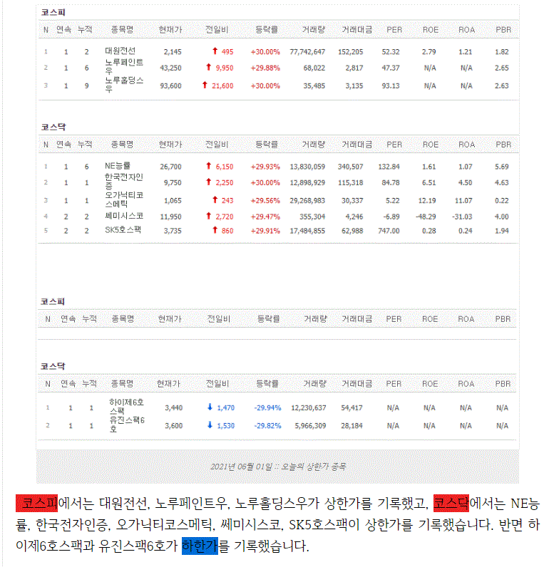 2021년 06월 01일 오늘의 상한가 종목 및 이유 :: 대원전선 NE능률 한국전자인증 오가닉티코스메틱 주가 외 지난 뉴욕증시는 Memorial Day로 휴장이라고 말씀드렸습니다. 금일 코스피 지수는
